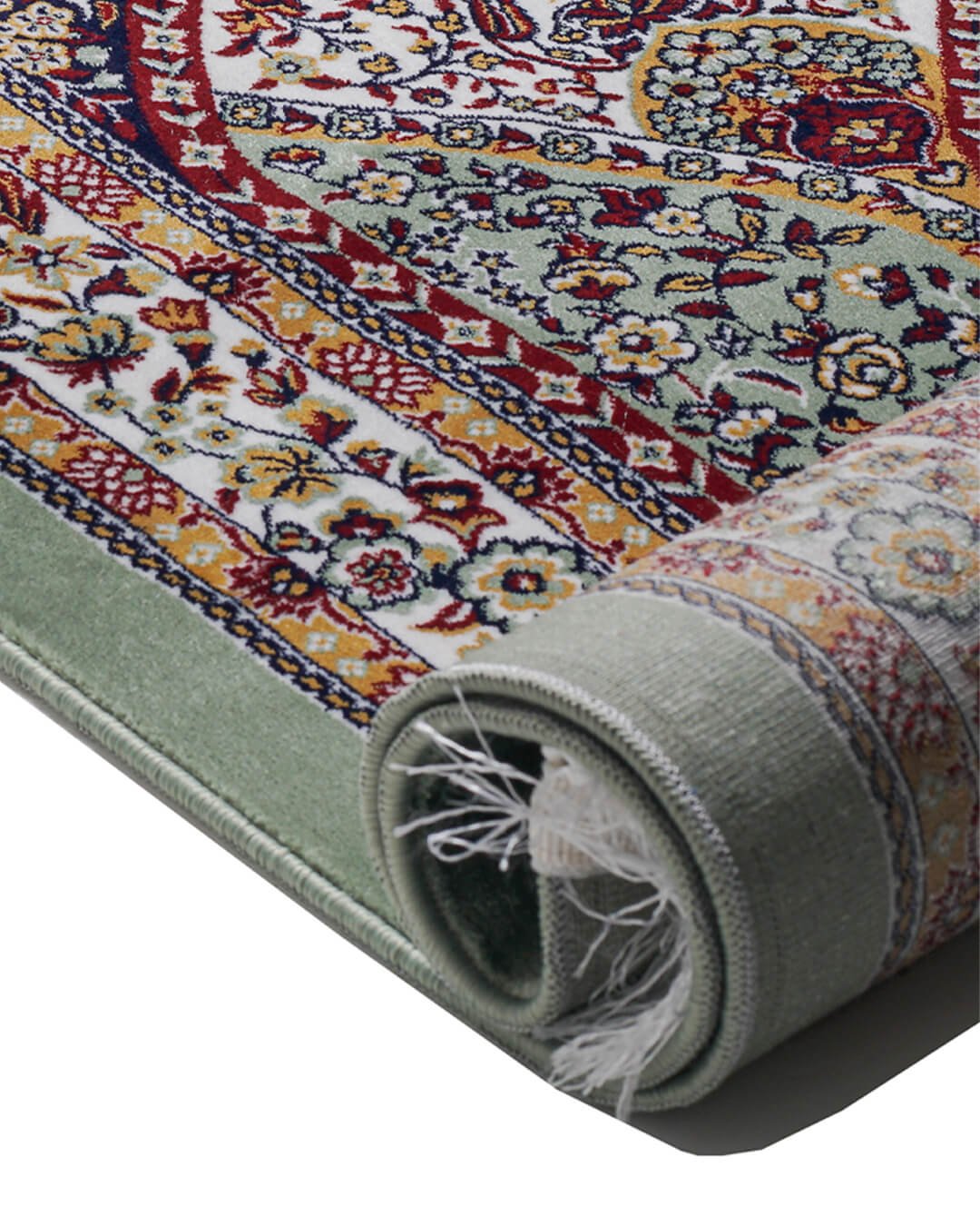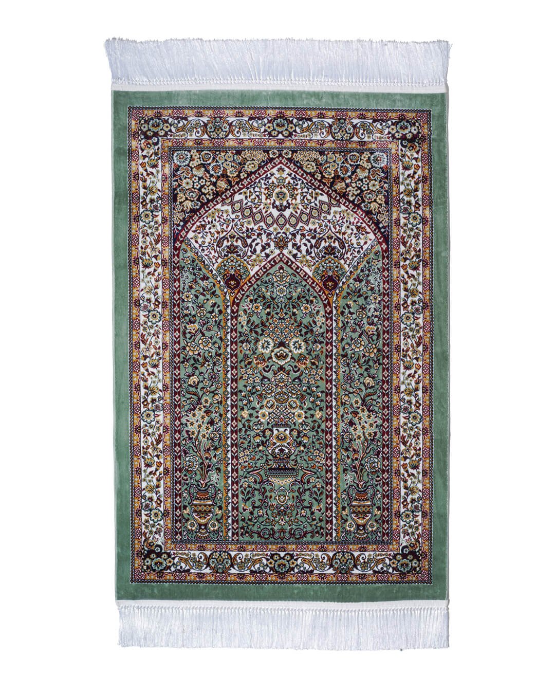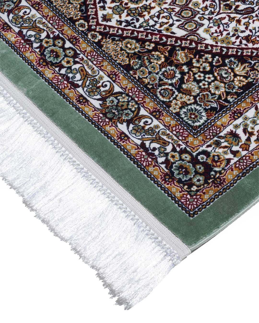 • Tepi Berumbai: Sajadah diselesaikan dengan rumbai putih bersih tradisional pada ujung yang lebih pendek.